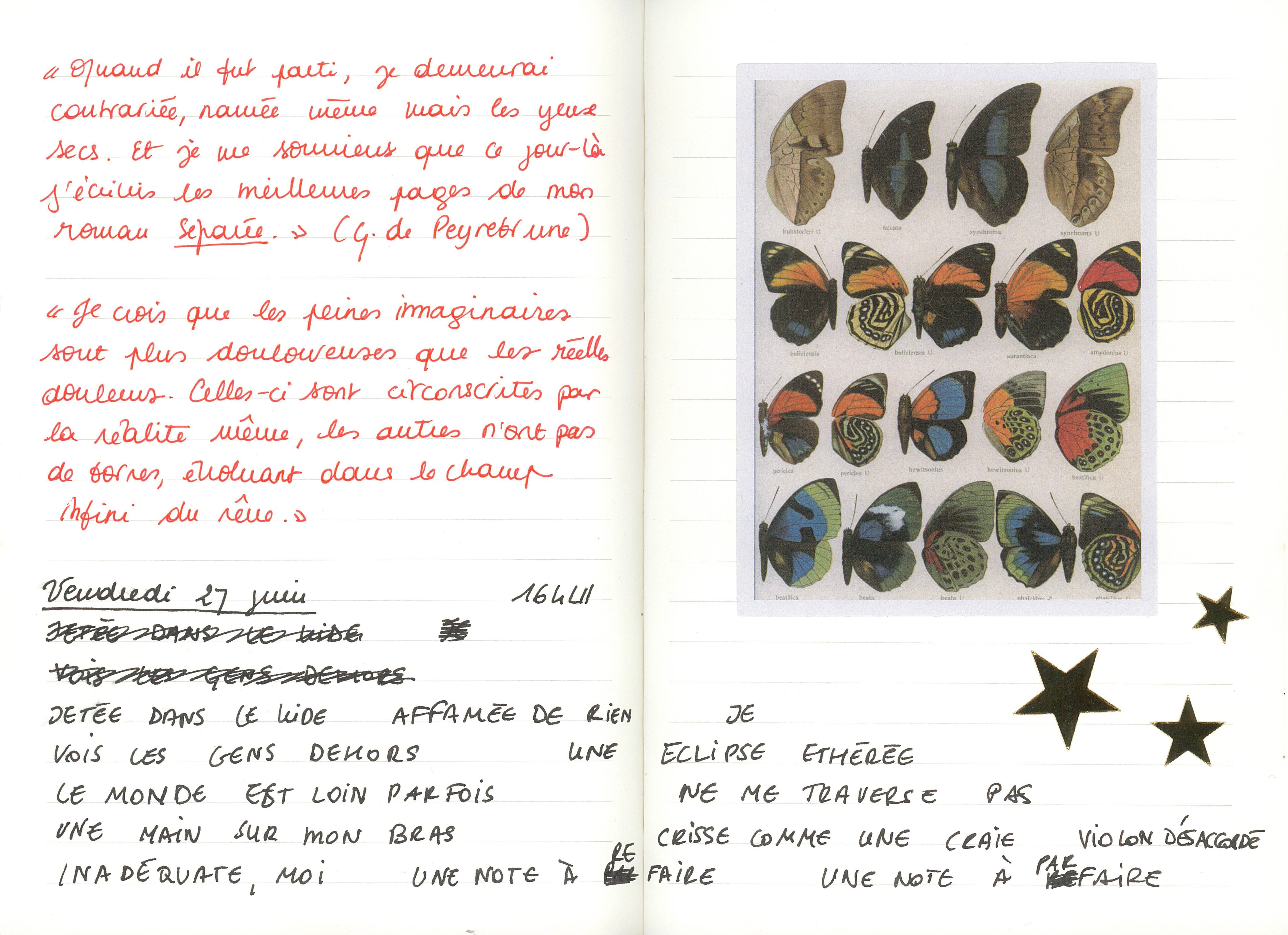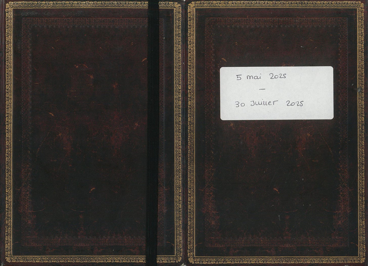 Ce carnet m’a été offert par E, il y a cinq ans peut-être. Il était plus petit que mes carnets habituels, entre le format A5 et le A6, il était ligné et j’ai apprécié avoir un carnet plus pratique à transporter (et plus rapide à remplir).