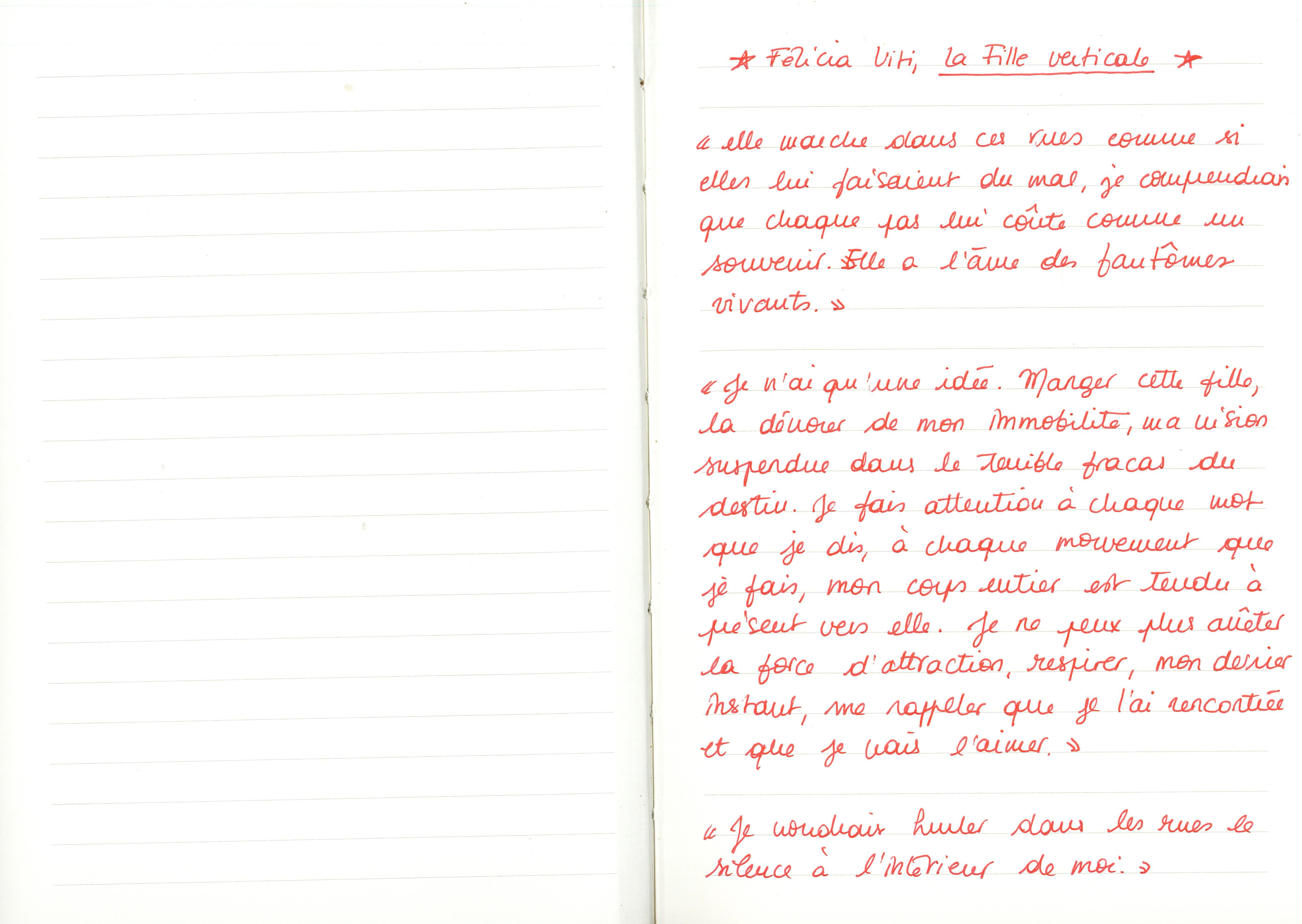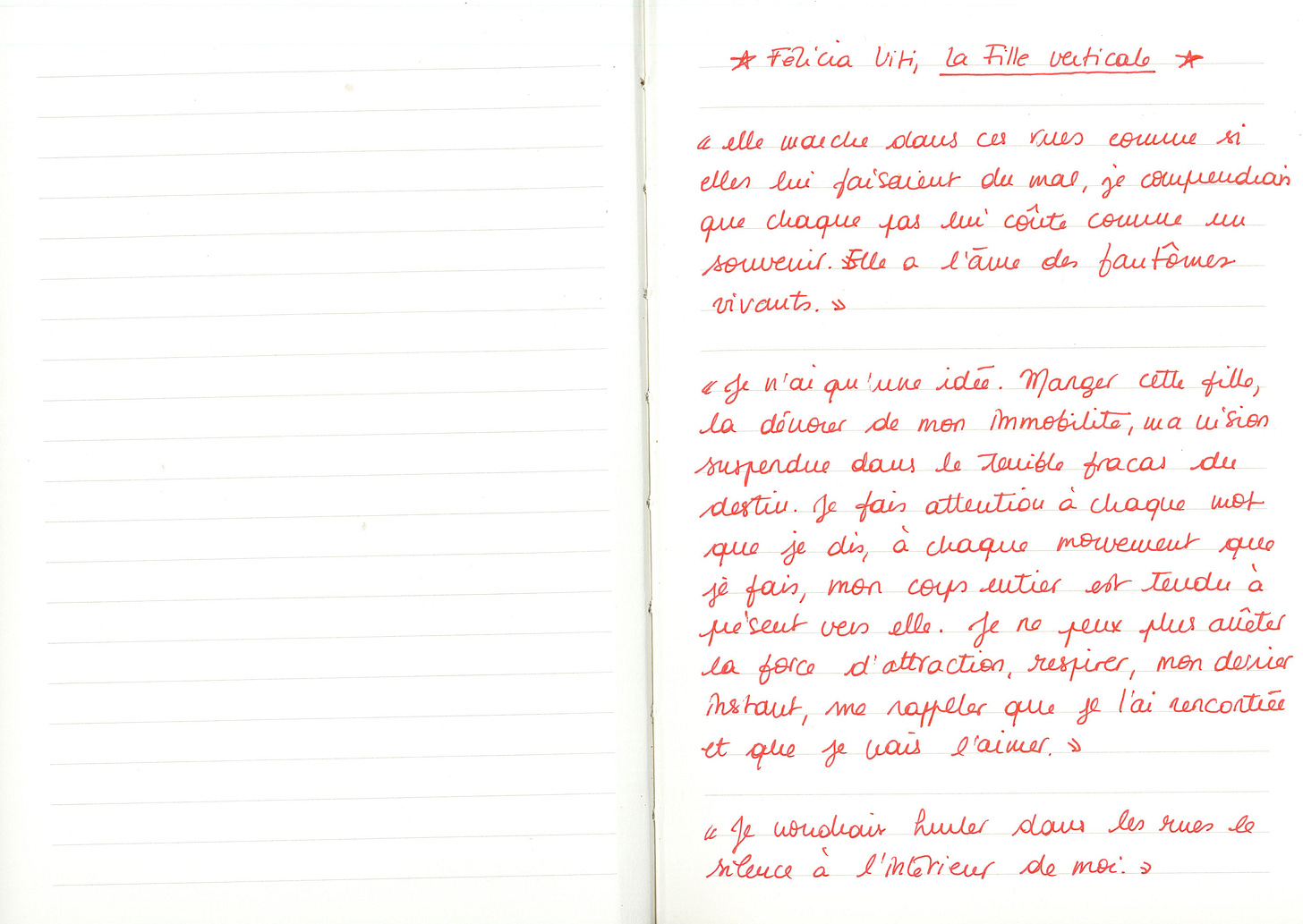Je l’ai entamé avec une page de citations du livre que je lisais alors : La Fille verticale de Félicia Viti. Roman contemporain, trouvé au hasard de ma petite librairie d’occasion préférée, il raconte l’histoire de deux femmes qui s’aiment puis se déchirent, à coups de passion effrénée et de violences conjugales. Un roman qui plaira à celleux qui ont aimé Ça raconte Sarah de Pauline Delabroy-Allard.1