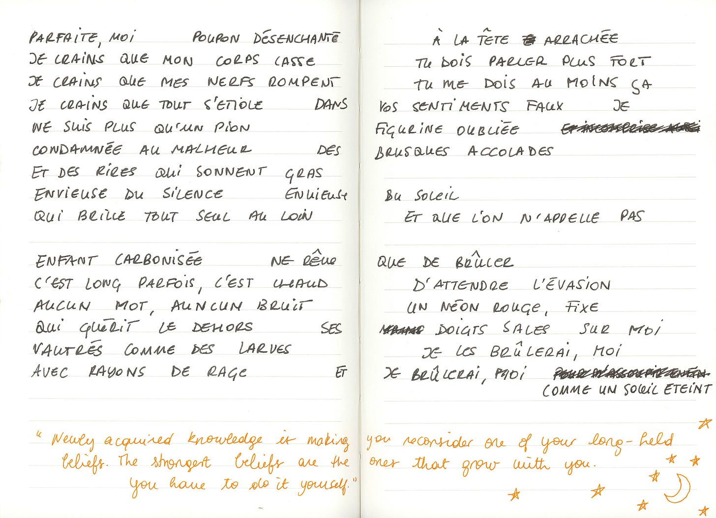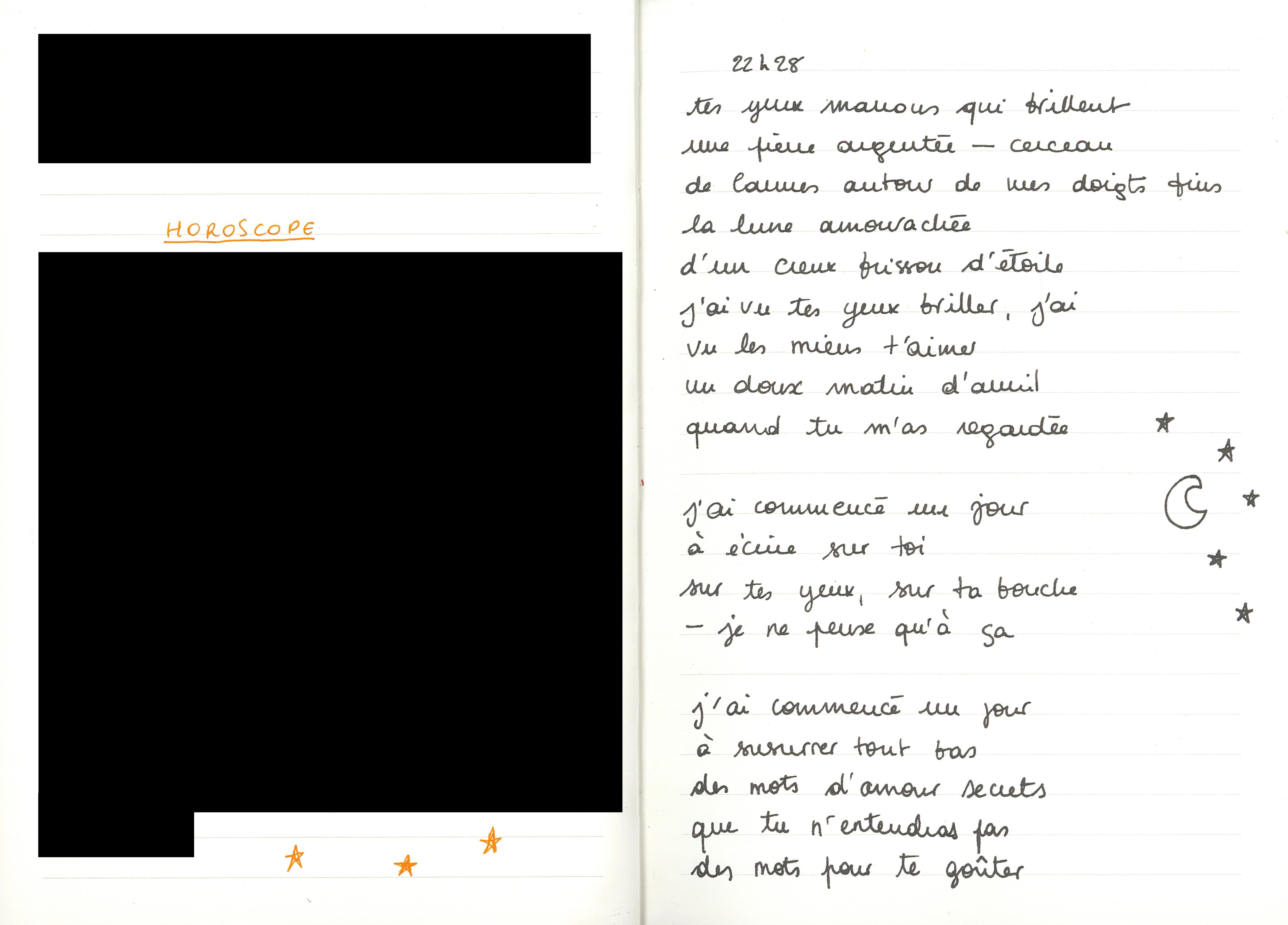 Je note souvent mon horoscope Co-Star dans mes carnets, quand je trouve qu’il résonne particulièrement bien avec mes pensées du moment. J’écris moins souvent des poèmes d’amour, mais celui-là s’est écoulé tout seul, un soir où la lune brillait comme un joyau. Je suis sortie la voir parce qu’elle n’apparaissait pas depuis ma fenêtre. Je me suis plantée là, sous elle, je me suis laissée penser, je suis rentrée chez moi puis j’ai laissé l’encre couler.