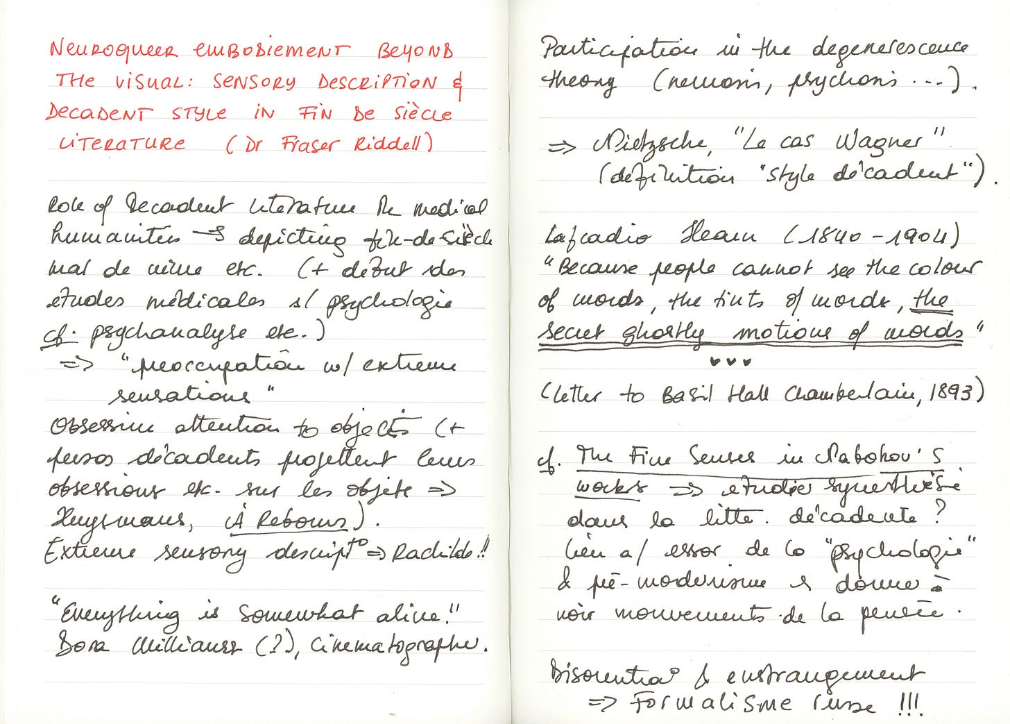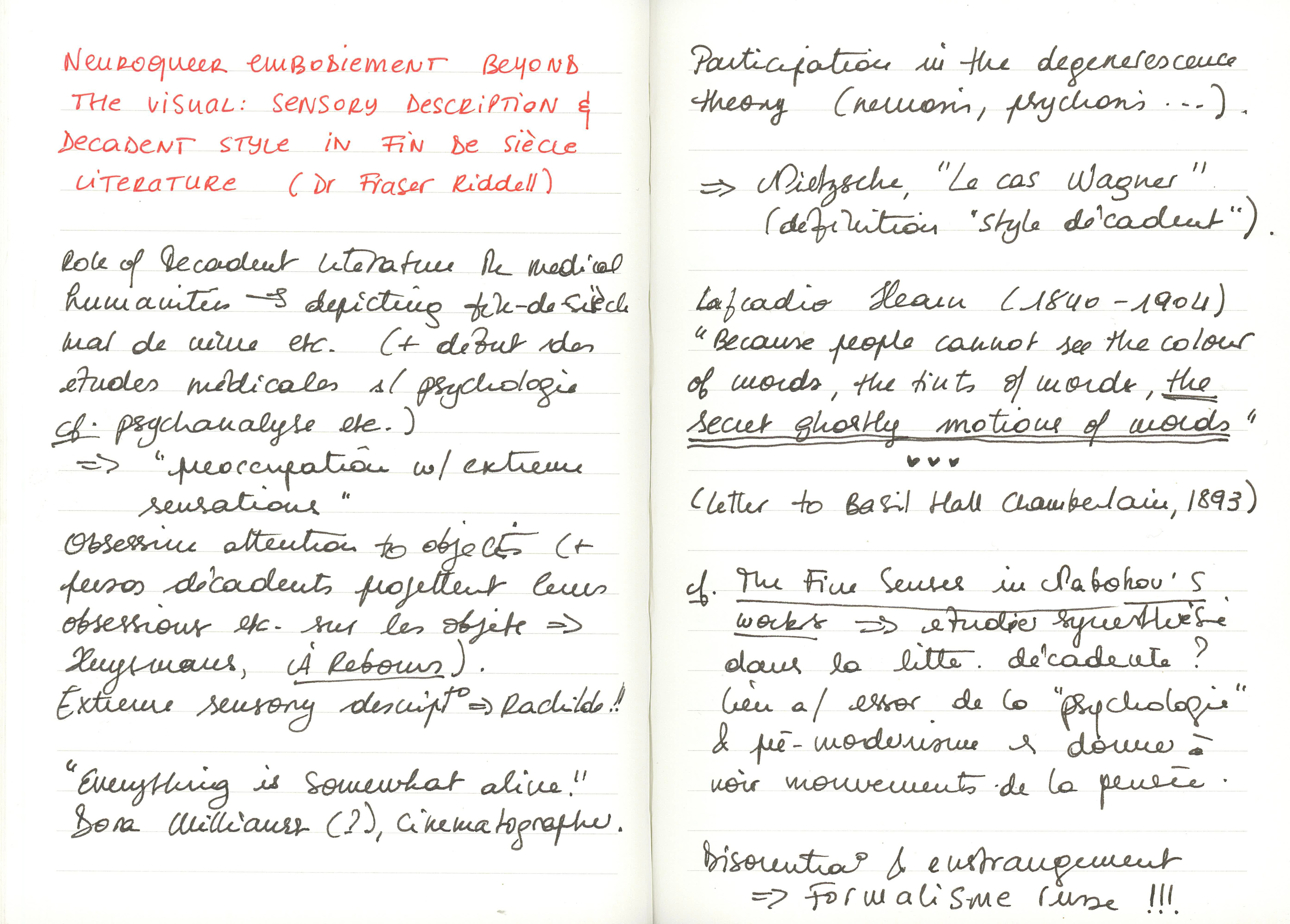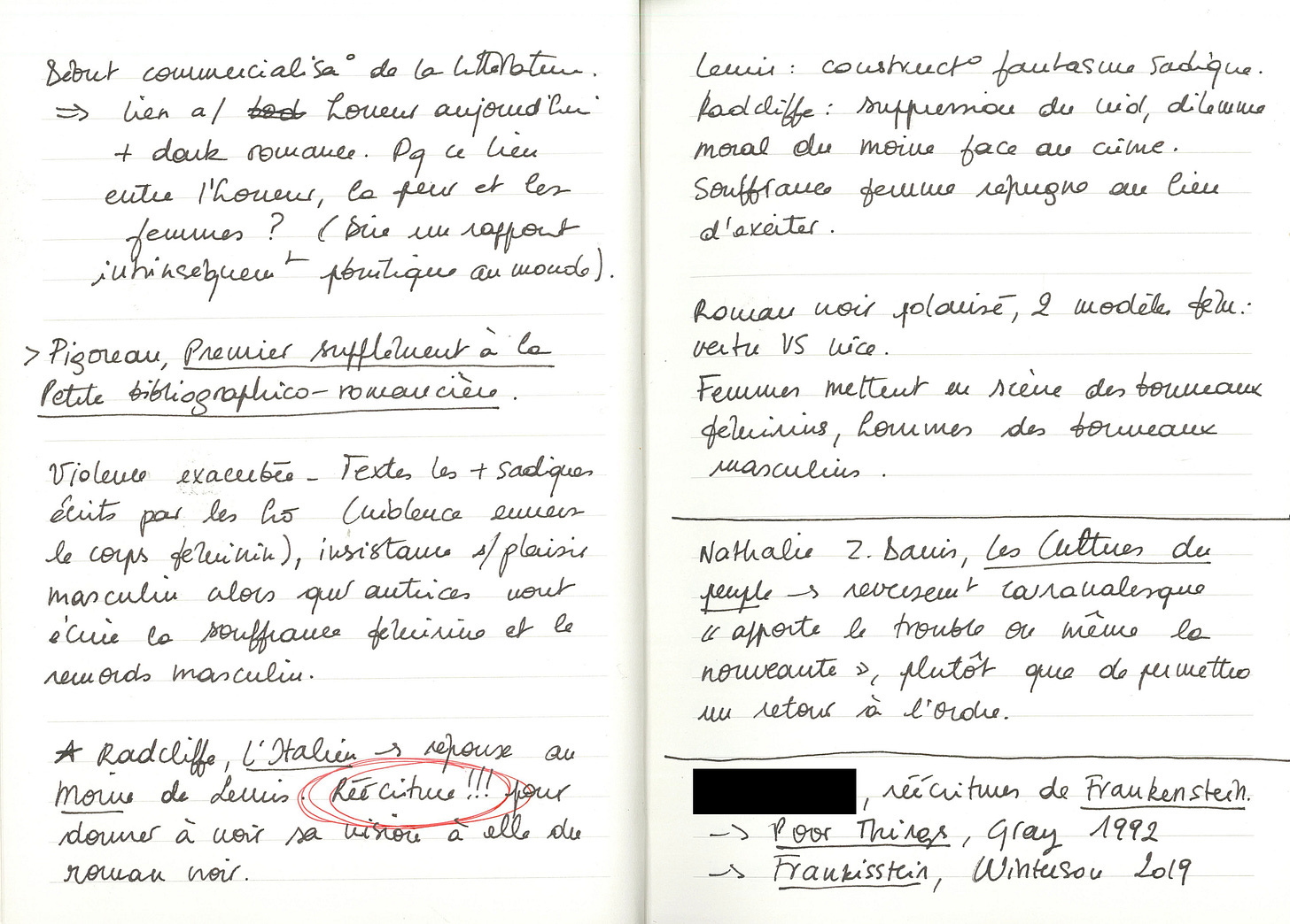J’ai participé en mai à une journée d’étude organisée par mon labo de recherche.2 Habituellement, lorsque je participe à des colloques, je prends mes notes dans un cahier dédié à ma thèse, mais ce jour-là les conférences n’avaient pas de réel lien avec ma recherche donc j’ai pris mes notes ici. J’ai quand même trouvé des éléments intéressants pour ma réflexion, comme la place de la réécriture dans les romans noirs féminins du XIXe siècle.