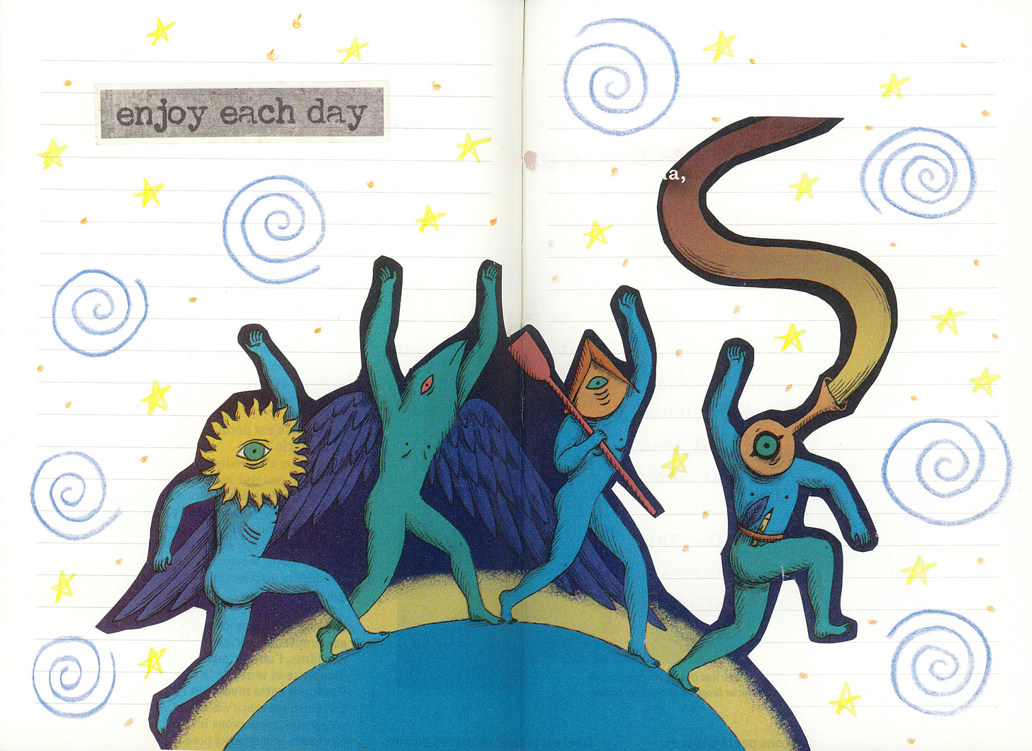 Et puis parfois… on a simplement envie de découper une image qui nous plaît et de dessiner des formes au crayon, sans s’inquiéter de faire quelque chose d’un peu moche. Le carnet respire et l’on passe à autre chose.