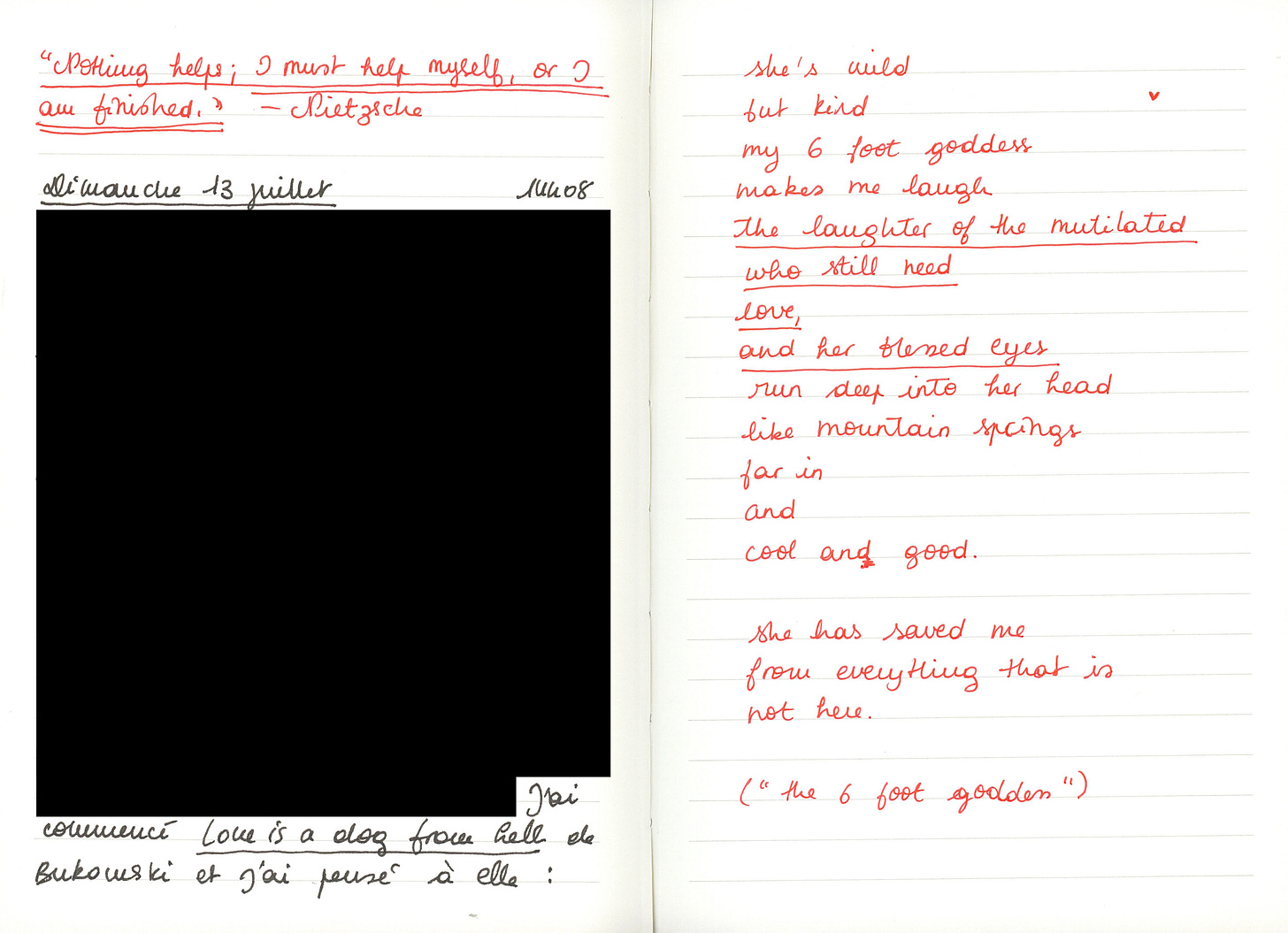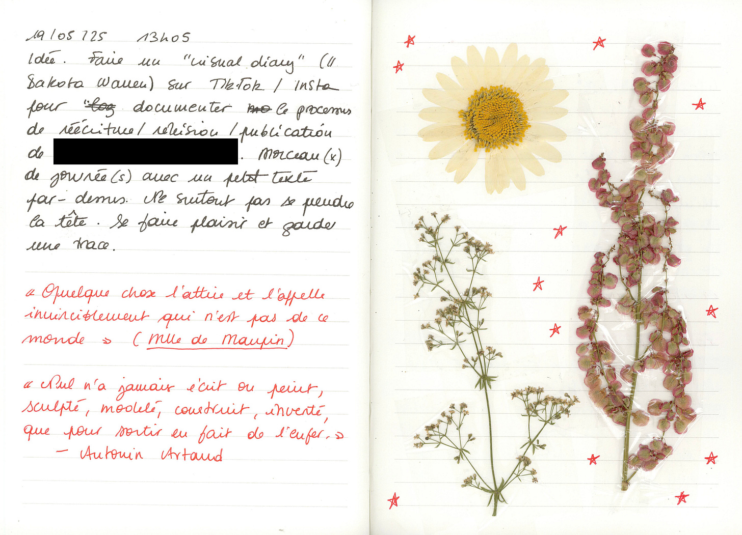 Lors d’une promenade dans la forêt avec ma sœur me vient une idée : faire un visual diary de mes projets d’écriture, filmer quelques secondes à chaque fois que j’écris quelque chose et le partager un peu partout, en donnant un contexte bref, un peu flou. J’en parle avec ma sœur en ramassant des fleurs. De cette longue conversation surgit aussi une idée de nouvelle, provisoirement intitulée “Dans la forêt”, et dont j’hésite à faire un roman finalement. C’est une histoire pour l’instant seulement entamée, une histoire d’horreur sur la recherche de soi et la recherche de l’Autre.