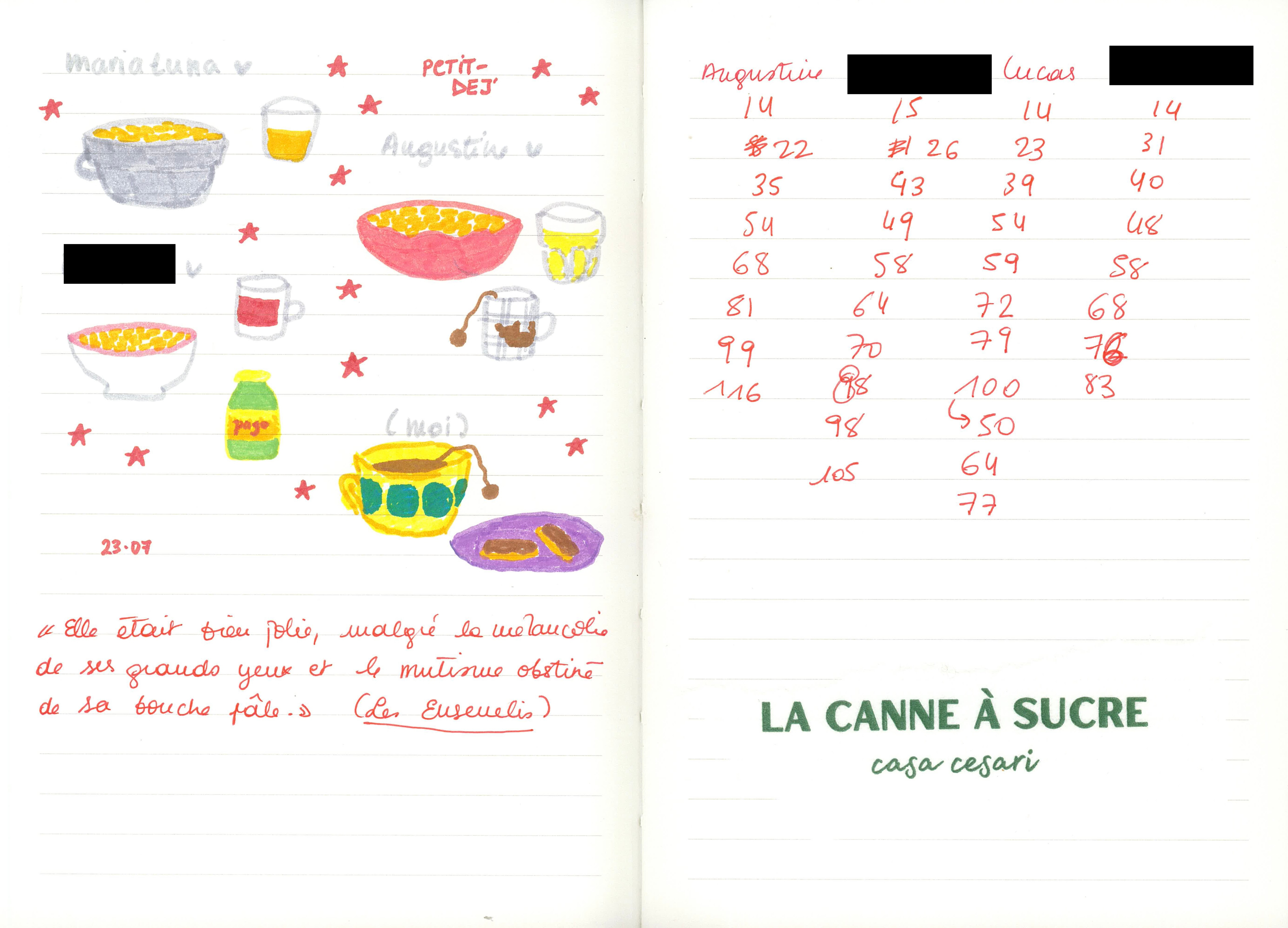 En juillet, je suis allée en Corse avec des amies. L’une d’elles est retournée vivre en Corse pour sa troisième année de doctorat, les deux autres continuent de faire leur thèse dans la même université que moi. On ne se connaît que depuis quelques mois mais on est un petit groupe qui fonctionne bien. Un matin, j’emprunte les feutres de M-L et je dessine nos petits-déjeuners. Plus tard, je prends mon carnet pour noter nos scores pendant un de nos énièmes jeux de cartes, autour de matchas et de chaï lattes.