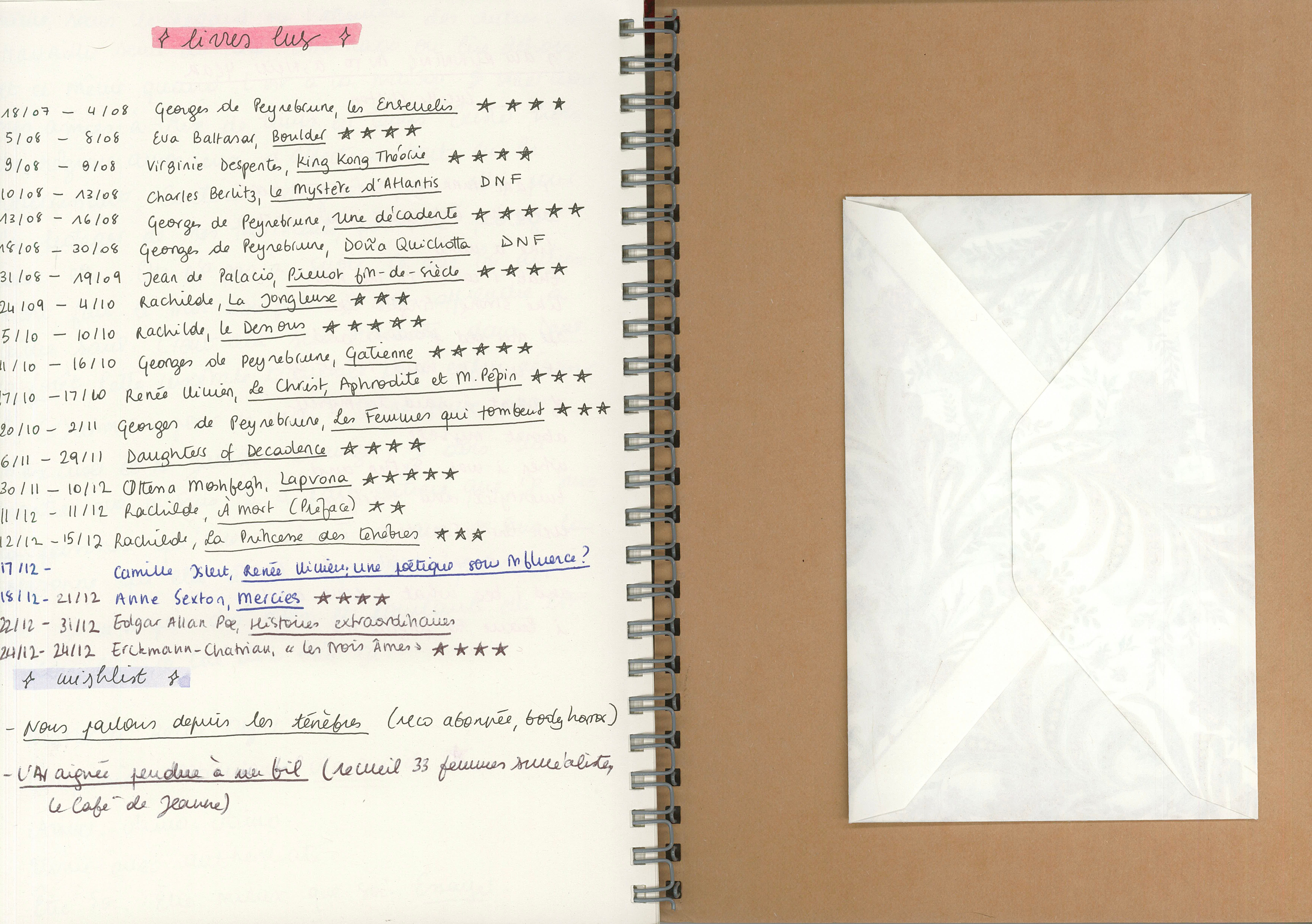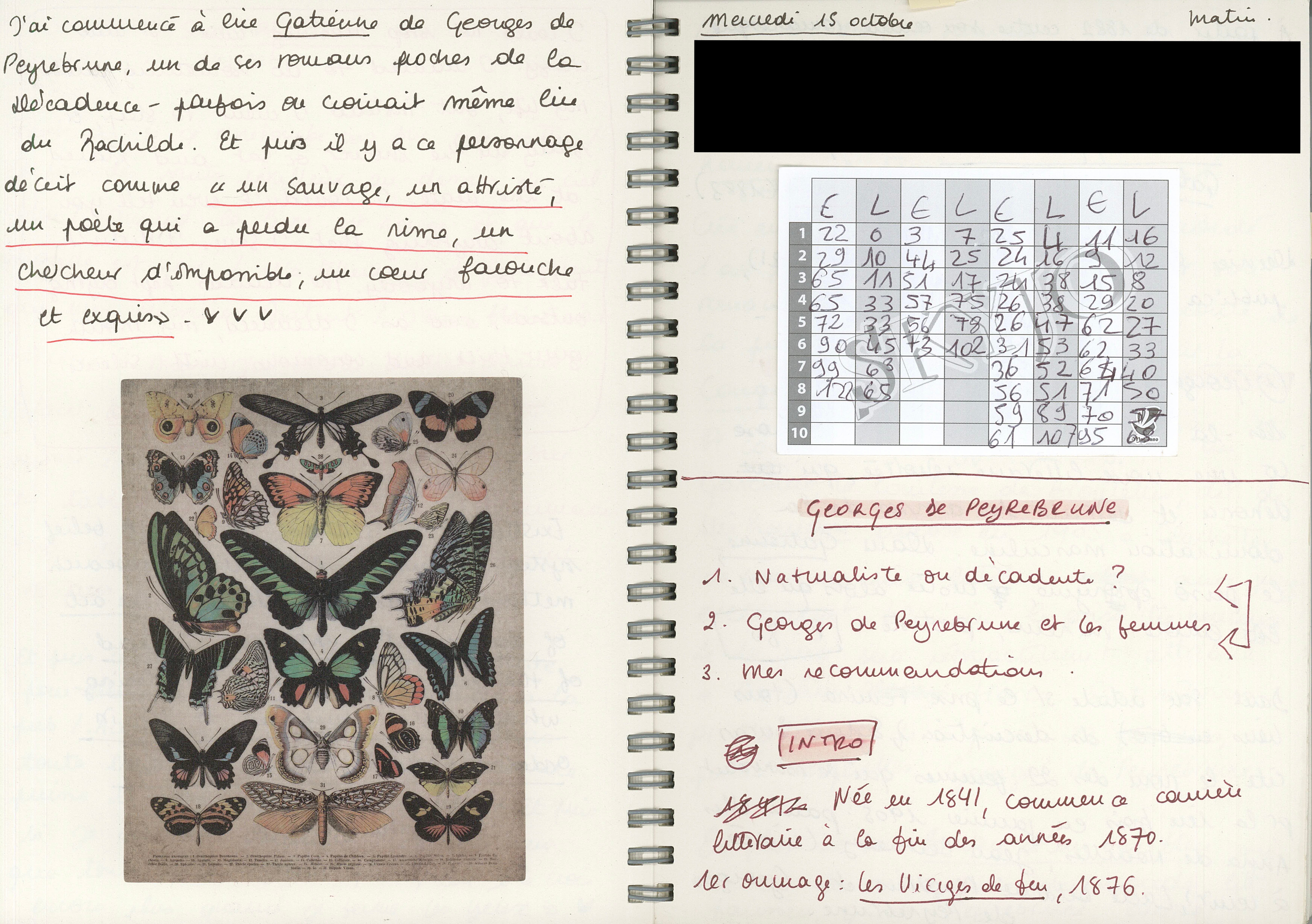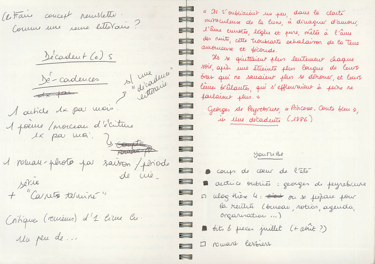 Comme toujours, j’utilise aussi mon carnet pour planifier et scripter mes vidéos Youtube. Cette semaine-là, je prends des notes pour une vidéo sur Georges de Peyrebrune3, autrice de la fin du XIXe siècle dont je viens de terminer le roman Gatienne.