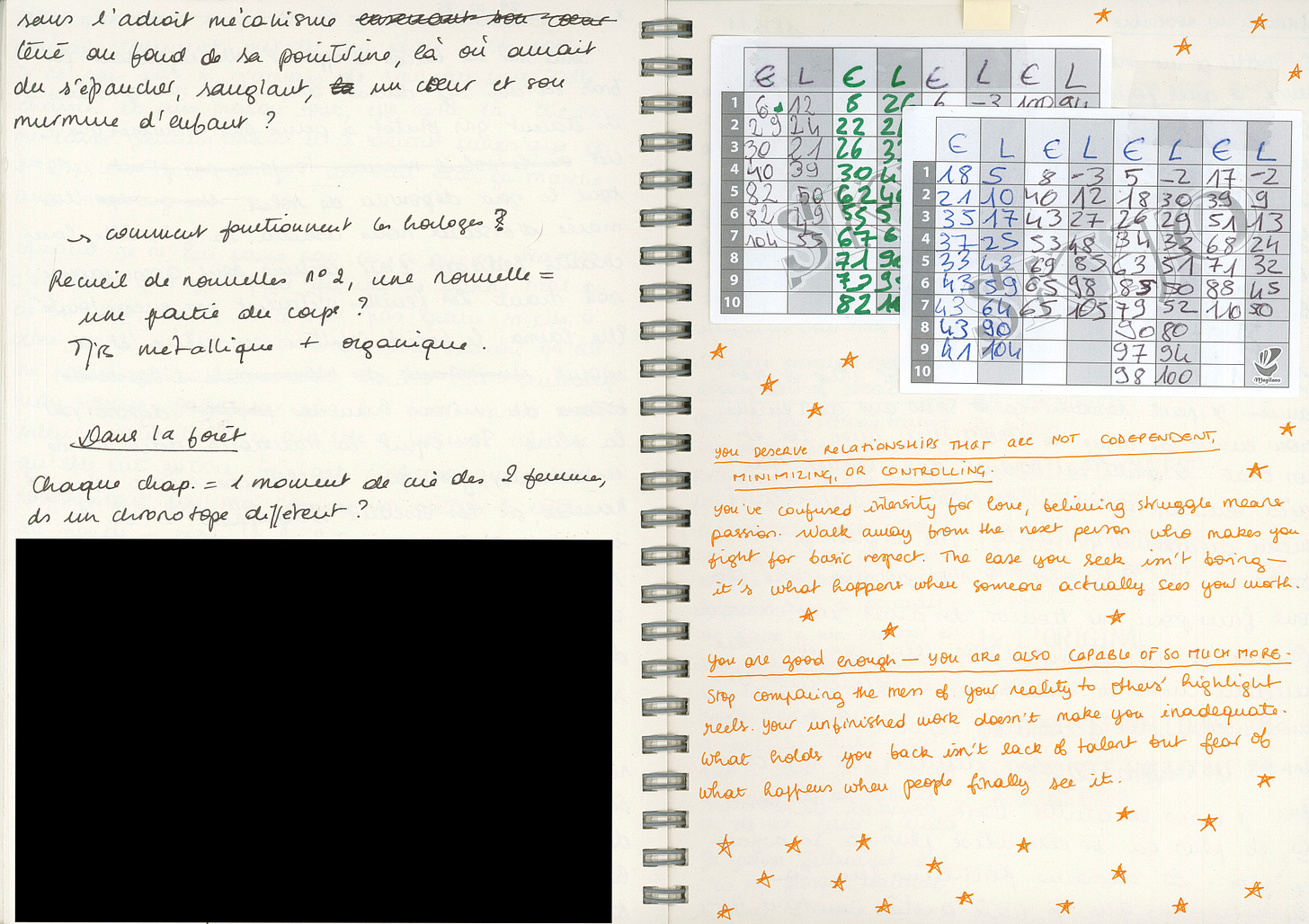 Au milieu des scores de Skyjo qui font légion, je continue d’écrire et de planifier des romans. Je prends ici quelques notes sur mon prochain projet romanesque, au titre provisoire “Dans la forêt” (le vrai titre sera bien meilleur, ne vous inquiétez pas). C’est un roman d’horreur centré sur une relation lesbienne et j’ai très, très hâte de commencer à l’écrire – pour l’instant, je réfléchis beaucoup à sa forme, et à comment mêler cohérence narrative et littérature expérimentale dans un seul et même texte (et surtout dans un long format).