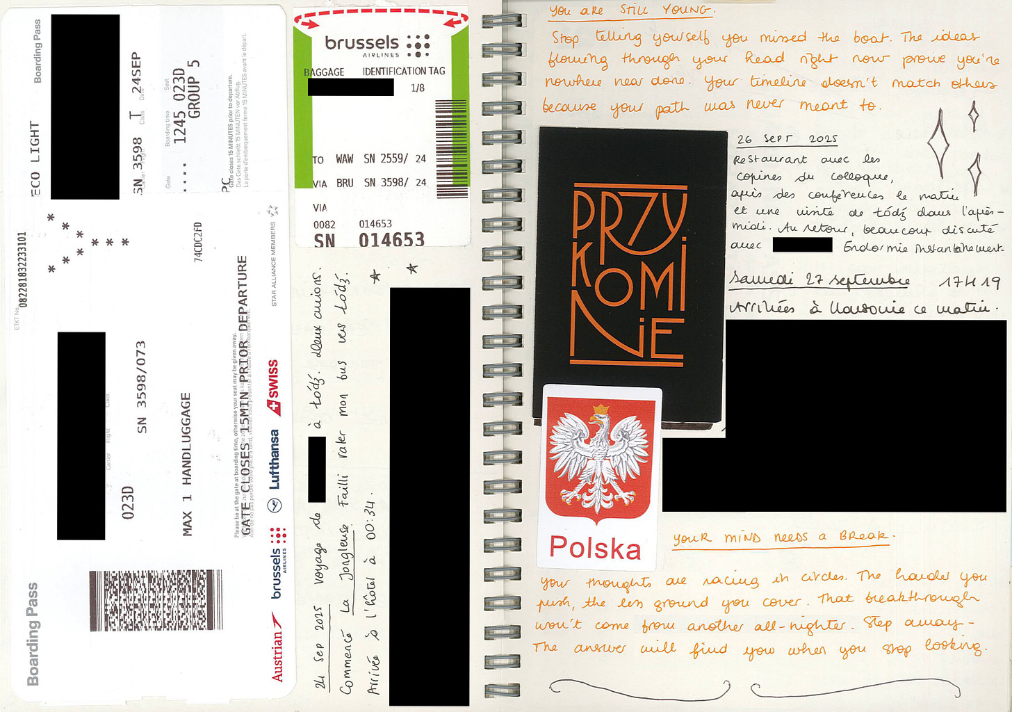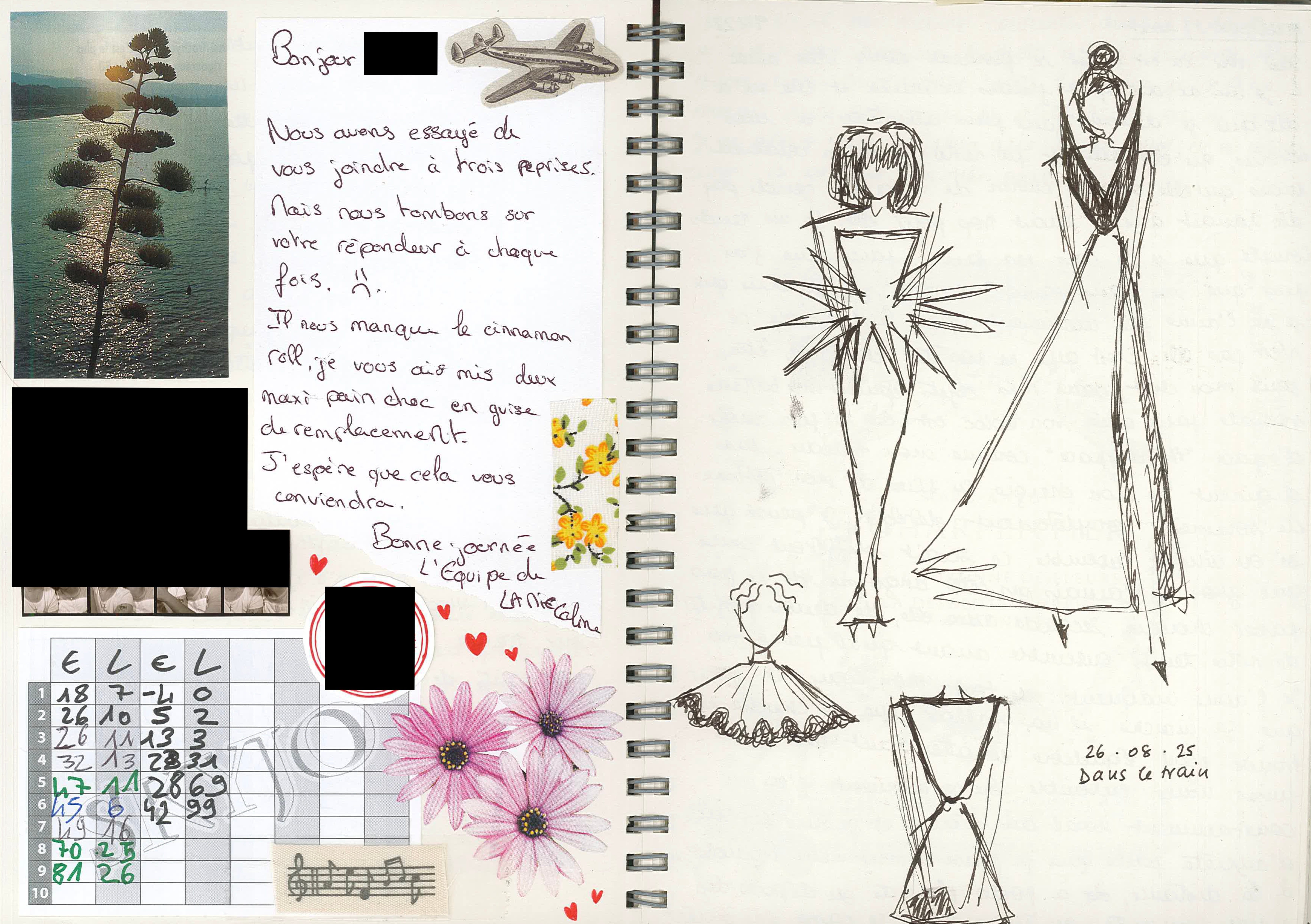 Si j’adore le train, je me suis vite rendue compte que je détestais les pages blanches. Dans une tentative d’apprécier davantage ce carnet, j’ai donc collé, pendant quelques pages, des feuilles lignées afin de retrouver un peu de mon confort d’écriture.