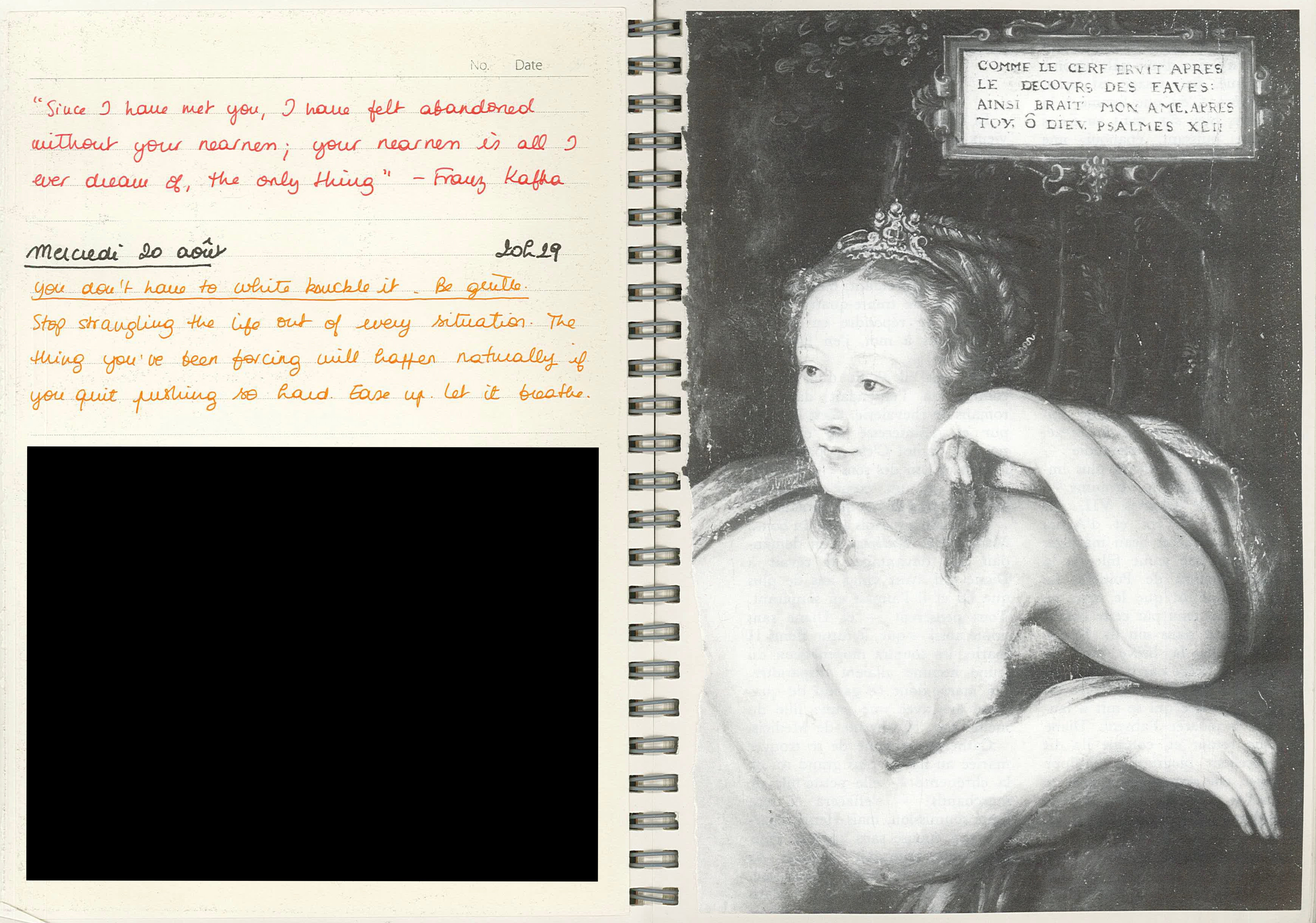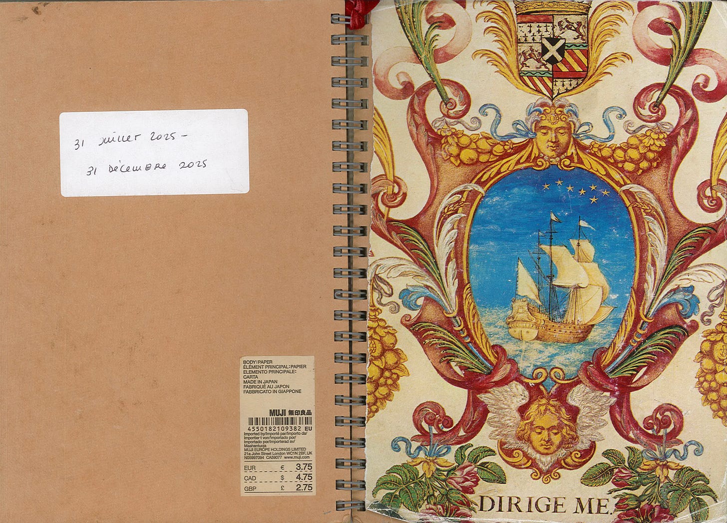 En juillet dernier, après avoir terminé mon ancien carnet1, je décidais d’agir en adulte responsable et d’utiliser un ancien carnet, acheté à Muji lors d’un voyage à New York il y a quelques années et jamais utilisé, plutôt que d’en acheter un nouveau. Je voulais essayer les pages blanches donc ça tombait bien, bien que je déteste les carnets à spirales. J’ai collé cette image trouvée dans un vieux livre de brocante, et c’était l’heure de customiser ma page d’ouverture – une tradition que je chéris tout particulièrement.