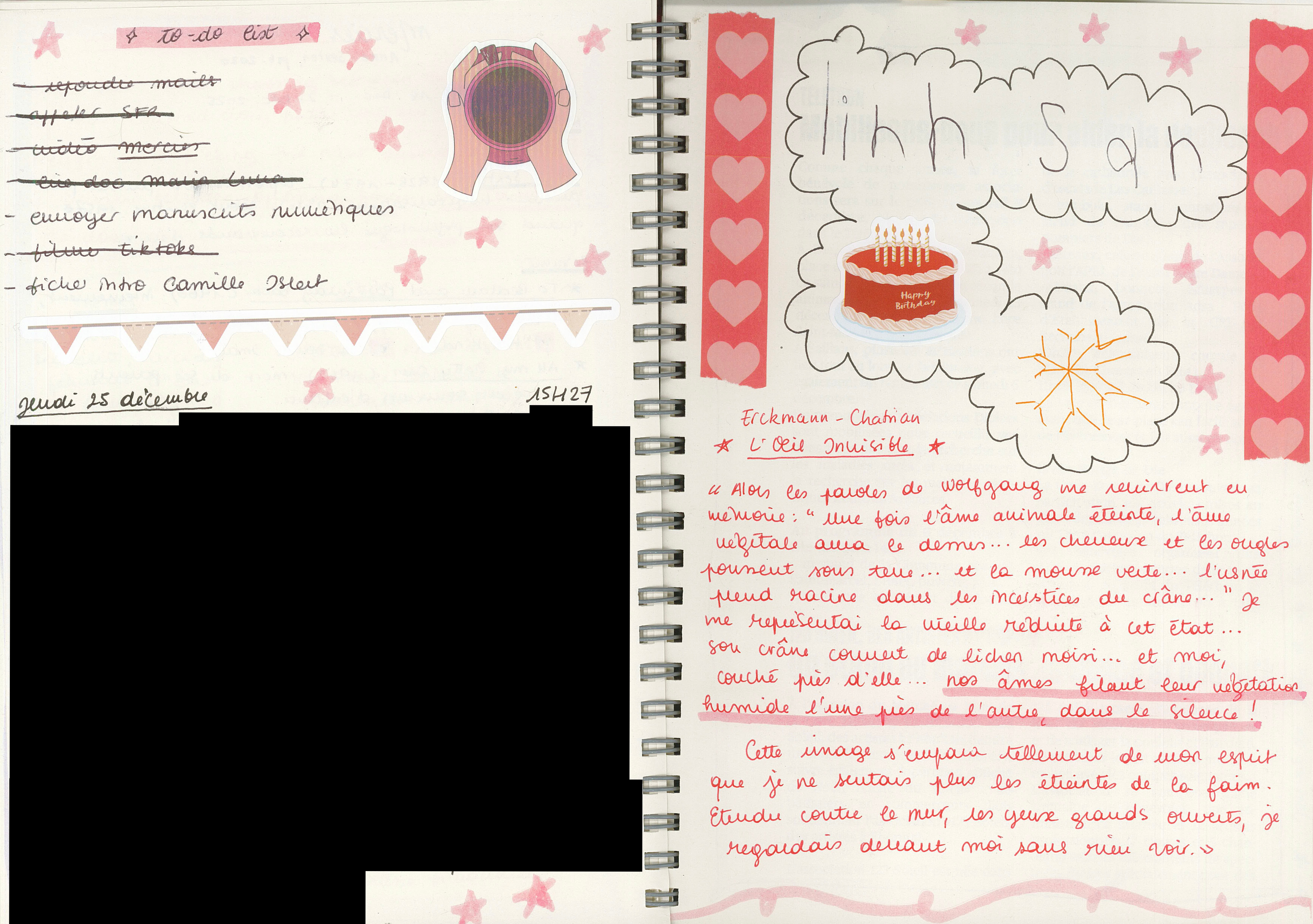 En cette fin d’année, j’ai laissé ma petite cousine signer mon carnet et j’ai lu L’Œil invisible d’Erckmann-Chatrian, nouvelle recommandée par ma grand-mère d’un auteur de la fin du XIXe siècle que je ne connaissais absolument pas. J’ai été très agréablement surprise par ce texte, qui me donne envie de découvrir le reste de son œuvre.