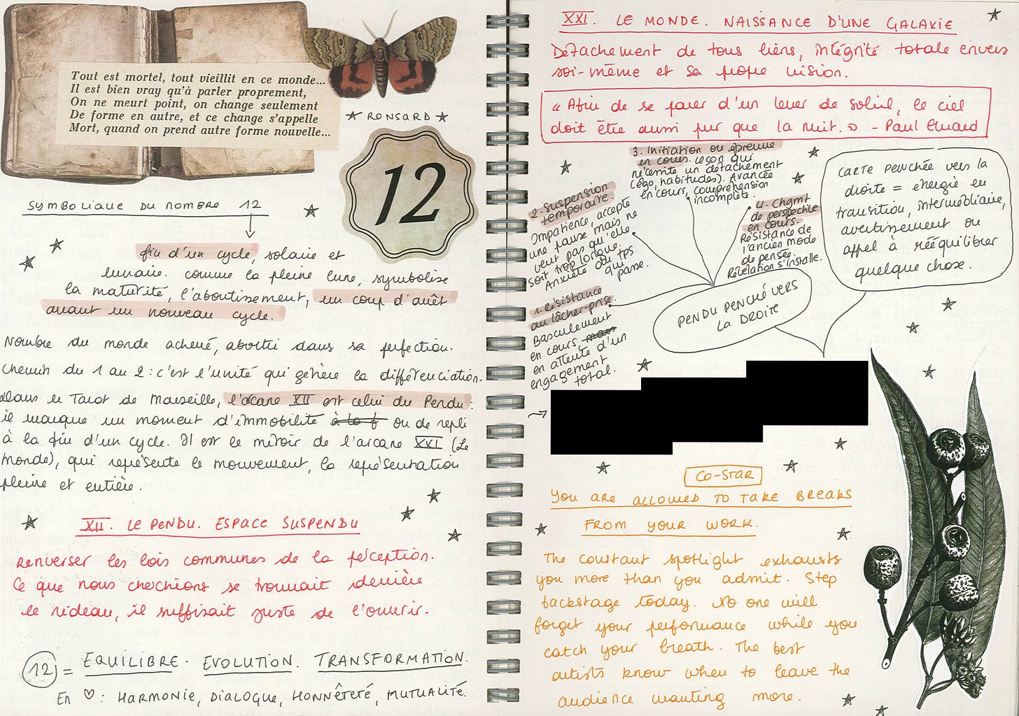 Au milieu de ce vrac mental, très représentatif de la désorganisation de ces quelques mois, plusieurs pages étonnent par leur esthétisme. Dans une enquête sur la signification du nombre 12, je prends des notes sur l’arcane XII du tarot et ses différents symboles. Cela faisait quelques semaines que mon exemplaire du Pendu se décollait du mur de ma chambre, restant penché vers la droite.