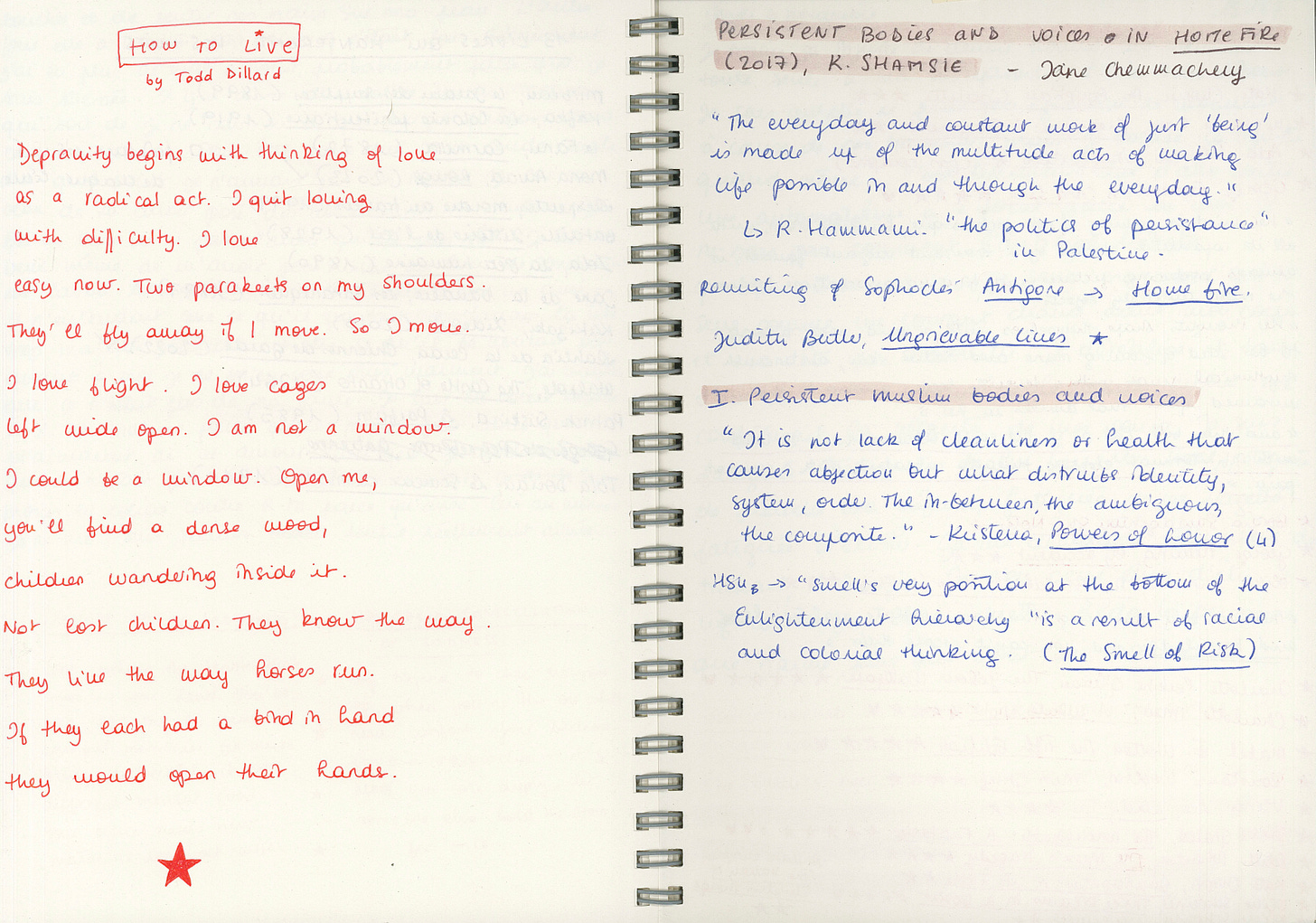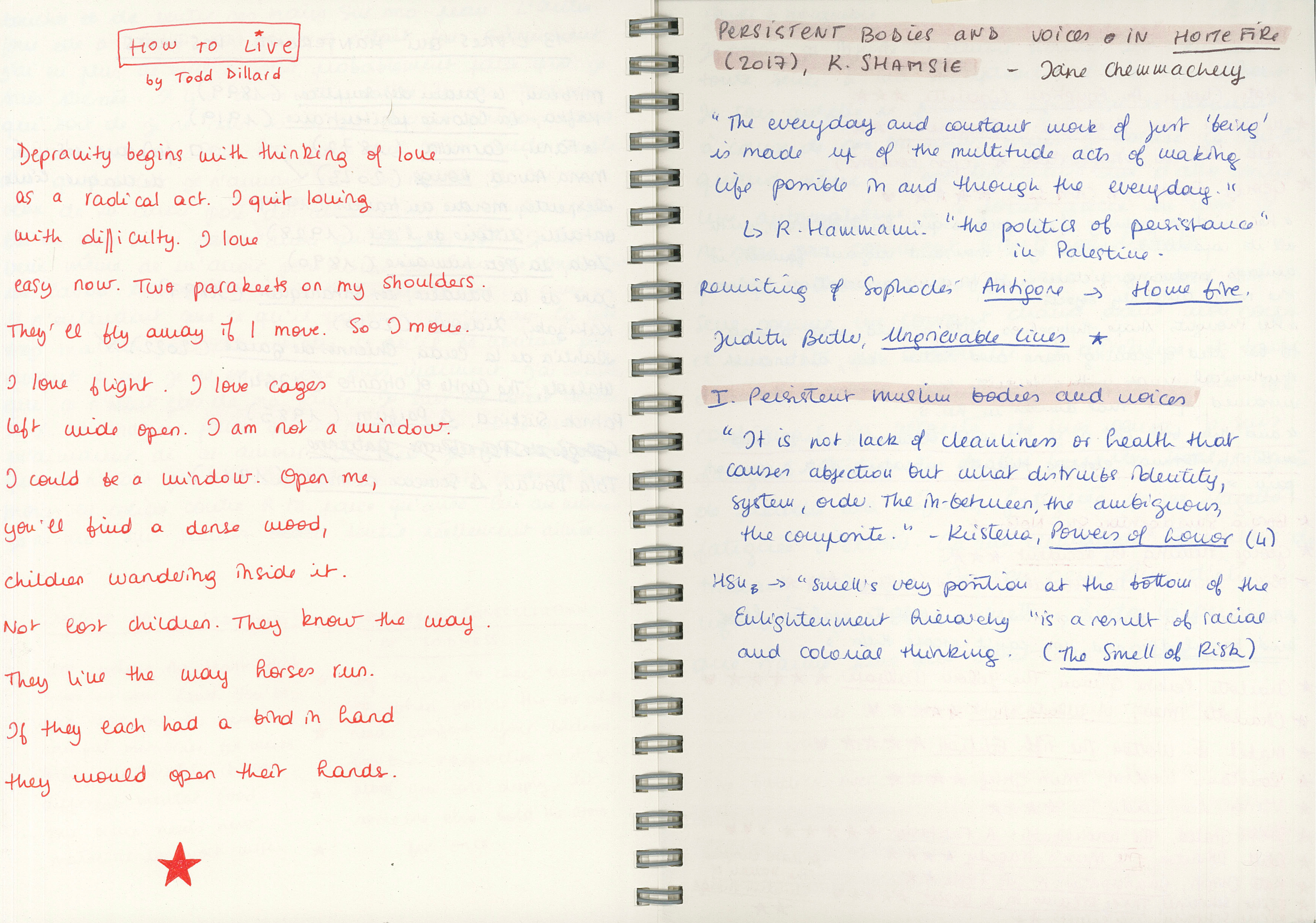 Je laisse aussi de la place aux mots des autres – ici le poème “How to live” de Todd Dillard et des notes prises lors d’une conférence organisée par M-L. Je note notamment le titre Ungrievable lives de Judith Butler, autrice du célèbre Gender Trouble.
