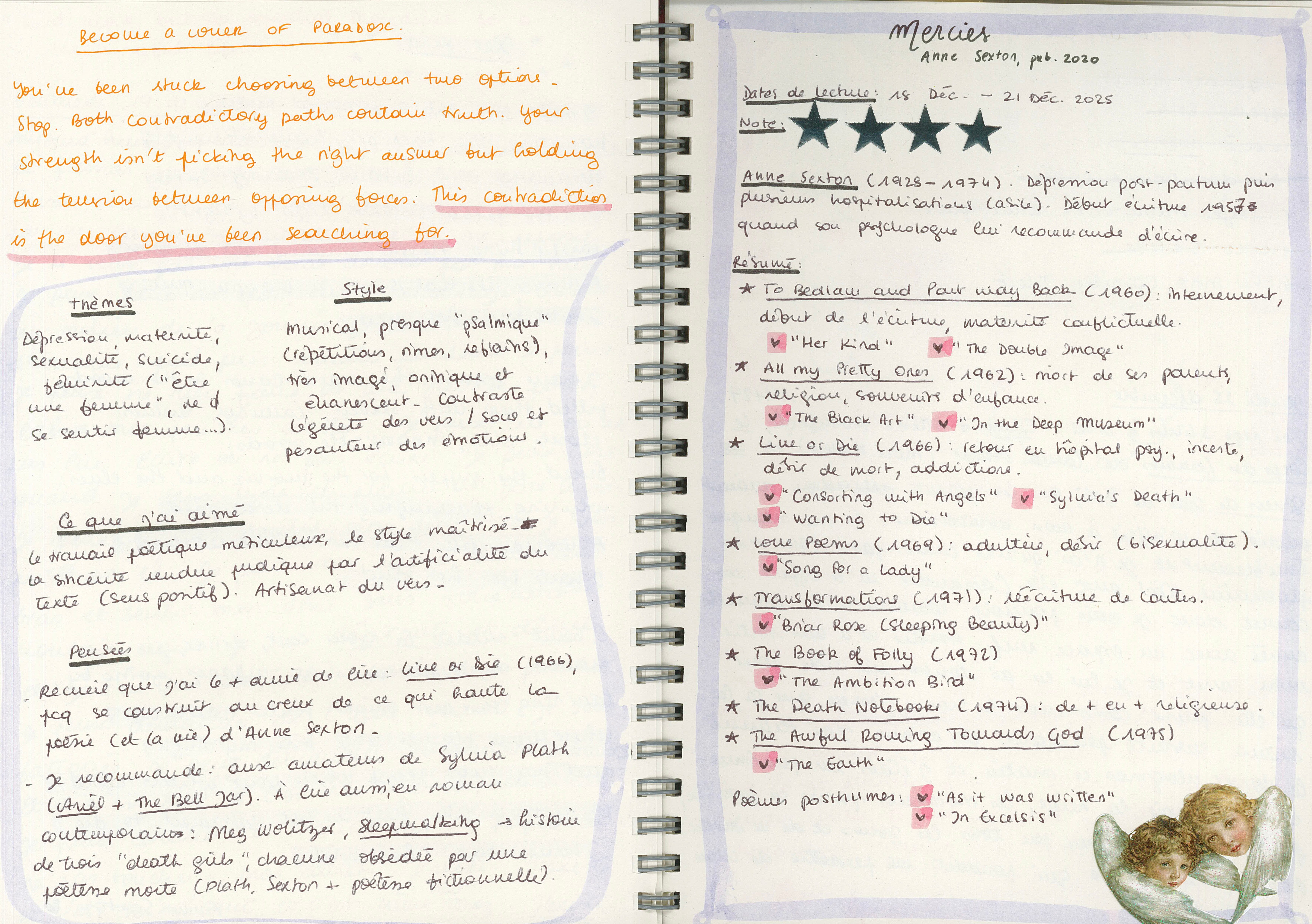 Je prends ainsi des notes sur les livres que je lis, sans avoir de catégorie précise à remplir, simplement pour avoir un endroit où développer mes idées et mes interprétations. Je l’ai fait pour Lapvona, un roman d’Ottessa Moshfegh que j’ai absolument adoré5 ainsi que pour Mercies, recueil de poèmes d’Anne Sexton6 :