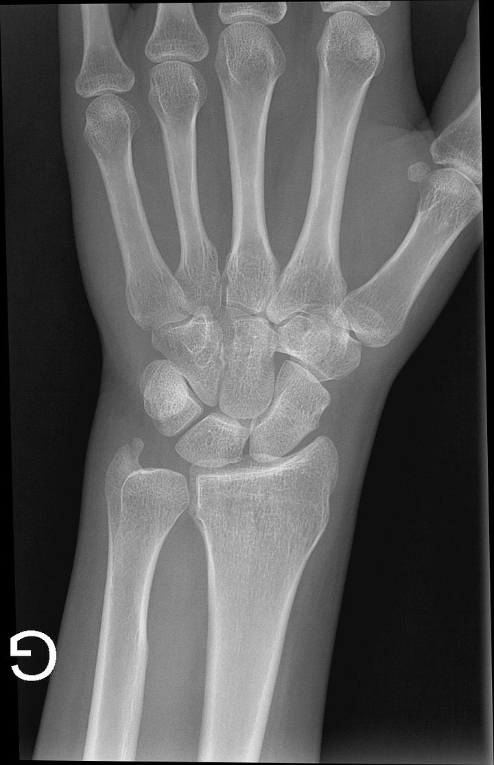 Sur les radios de mon poignet gauche, le médecin identifie deux fractures : une fracture de l’os capité et une fracture située à la pointe du radius.1